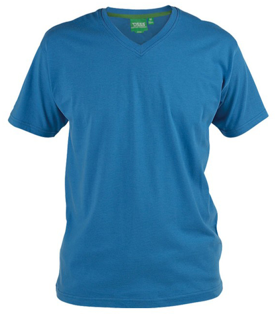 Blå t-shirt med V-udskæring i store størrelser fra D555. T-shirten er 100% bomuld, og vi sælger den i størrelserne 2XL-6XL.