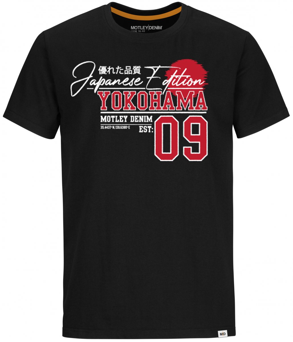 Opdater din casual kollektion med denne store t-shirt fra Motley Denim. Den er fremstillet i et behageligt 100% bomuldsstof i sort farve, har en klassisk hals med kort ærme og afsluttes med et japansk 'Yokohama 09'-grafikprint på brystet. For at holde den flot anbefaler vi vask ved 30 grader for at holde den pæn. Sæt den sammen med dine yndlingsjeans og kondisko for et afslappet weekendlook.